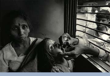 un enfant est vacciné dans la gare de la ville de Moradabad, dans